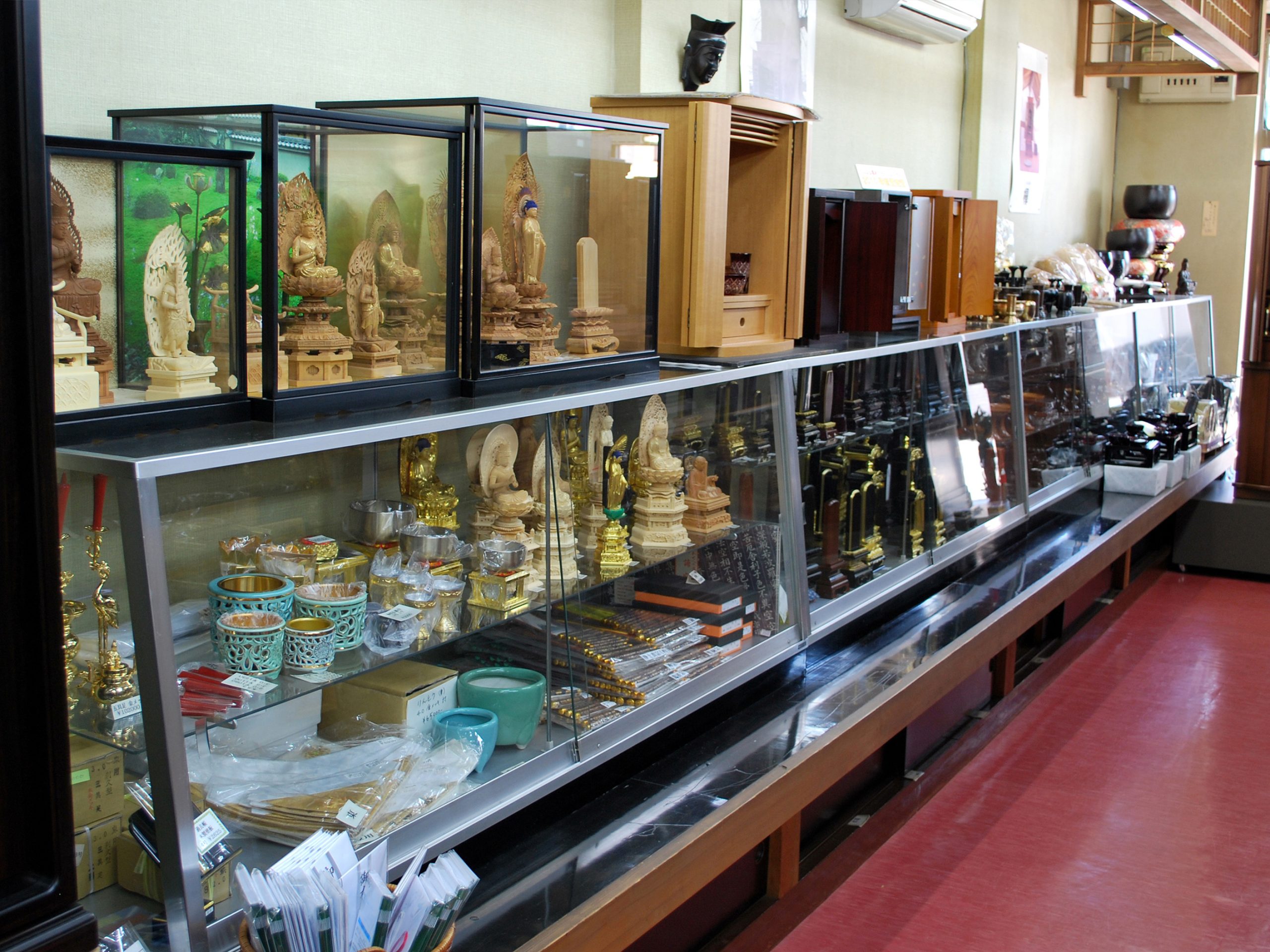 唐木仏壇、金仏壇、洋型仏壇、各種仏壇セット、ご仏像、お位牌、過去帳、掛軸、リンセット、仏前用座布団、仏壇おそうじセット、線香、